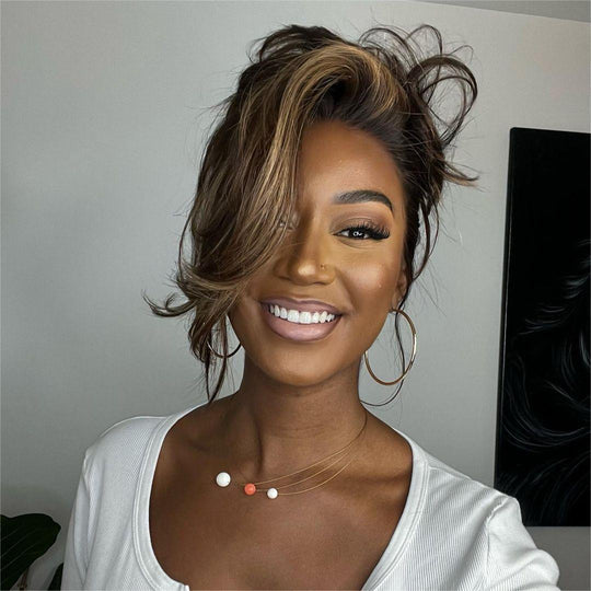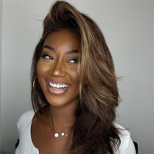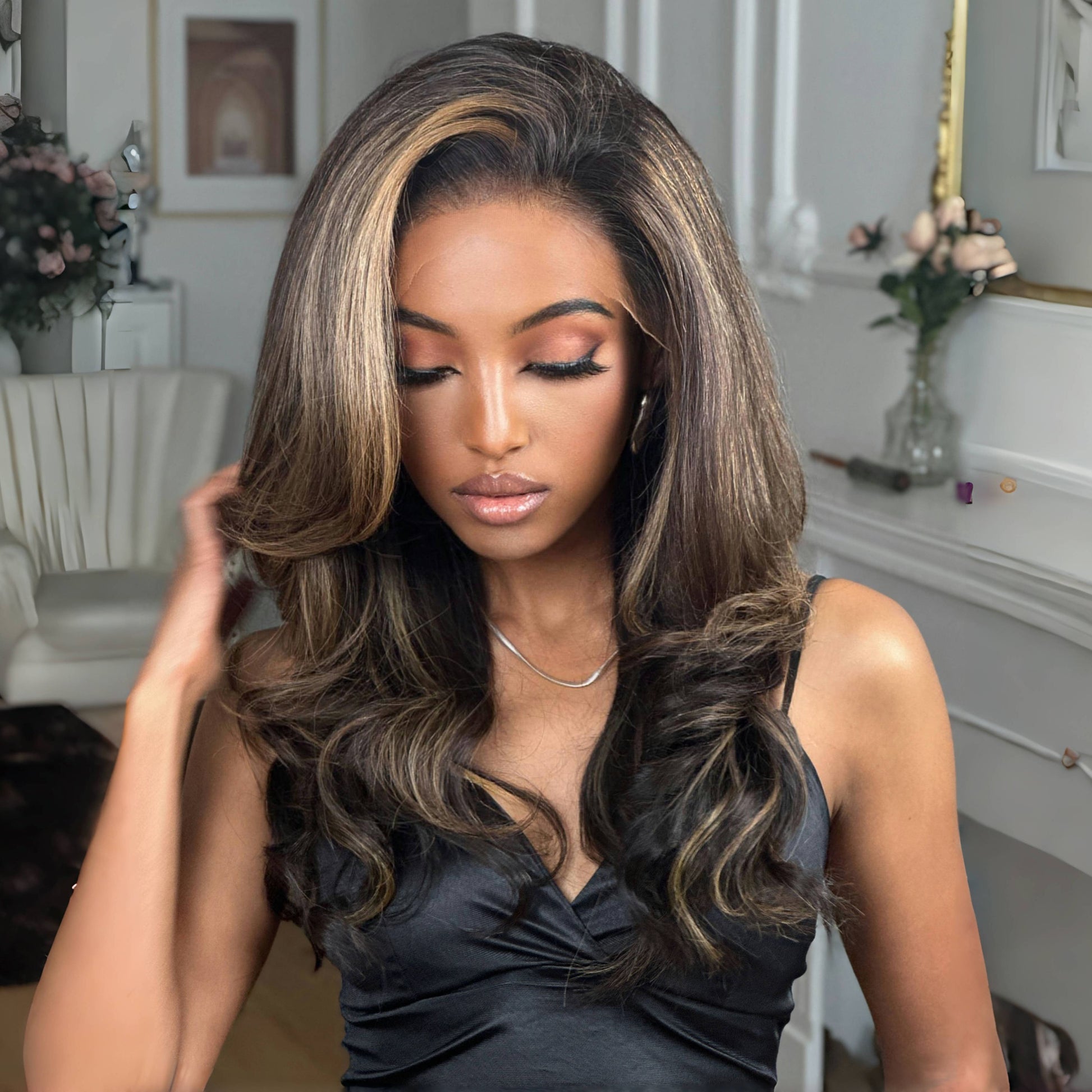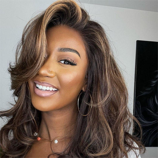Dark Brown With Blonde Highlights Layered Wavy 13x4 Lace Front Wig